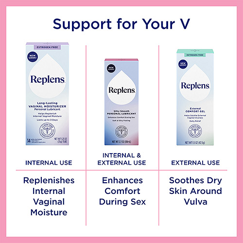 Replens is the #1 doctor recommended brand of vaginal moisturizers. Use Silky Smooth Personal Lubricant before sex or as needed for enhanced comfort during sex, alleviating vaginal dryness discomfort caused by hormone changes or medications.
